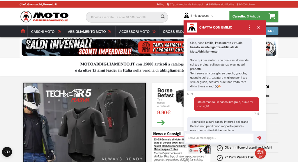 Motoabbigliamento è un punto di riferimento per gli appassionati di moto, con un ampio catalogo di abbigliamento tecnico e accessori, sia online che nei negozi fisici. La sfida era migliorare l’esperienza di ricerca e assistenza clienti, offrendo risposte precise, pertinenti e coerenti con il tono del brand, lungo tutto il percorso d’acquisto (dal sito web fino al punto vendita).